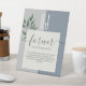 Elégante, moderne, simple, botanique, panneau de table bleu mariage bleu poussiéreux, avec initiales géantes monogrammes et aquarelle verte.