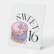 Ce panneau de piédestal présente les mots "Sweet 16" dans une police d'impression unique en lettres noires avec des points de remplissage et des saupoudrées dans ce doux thème et style de 16 ans. Imprimé avec une impression numérique pleine couleur de haute qualité disponible en 4 tailles en polystyrène 1/16" blanc 10" x 12" avec base de piédestal 3".
