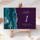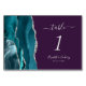 Le bord gauche de cette élégante carte de numéro de table mariage moderne comporte une bordure turquoise en aquarelle bleue, ornée d'une parties scintillant en faux argent. Le texte personnalisable associe écriture gris argenté, italique et polices cuivre sur un arrière - plan violet.
