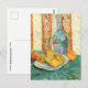 Eine Kunstpostkarte mit Vincent van Gogh's postimpressionistischem Gemälde, der ein niederländischer Künstler war, Still Life mit Decanter und Zitronen auf einem Tafel (1887). Ein Set mit Glaskaraffe und Früchten auf einem Tisch vor einem Hintergrund aus Tapeten.