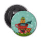 Un ouvre-bouteille avec l'image d'un adorable chat orange assis dans une tasse. Portant un casquette et une écharpe d'hiver. Les flocons de neige tombent contre un arrière - plan vert clair.