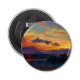 Un design artistique d'un beau coucher de soleil montrant également des rochers, la plage et un homme de pêche.