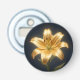 Golden lily flower in full bloom, luminous metallic gold petals with soft gradient highlights. Delicate natural detailing, dark moody background for dramatic contrast.