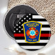 Petit ouvre-bouteille du service d'incendie de la ligne rouge - drapeau américain aux couleurs du drapeau de pompier, design moderne noir et rouge. Customisez avec le logo de votre département. Cet ouvre-bouteille personnalisé pour pompier est parfait pour les services d'incendie et de pompiers, des idées promotionnelles ou des cadeaux à vos pompiers. DROIT D'AUTEUR © 2020 Judy Burrows, Black Dog Art - Tous droits réservés. Logo personnalisé du service des incendies