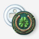 Illustration éclatante représentant un fer à cheval doré associé à un trèfle à quatre feuilles luxuriant et à des vignes vertes décoratives symbolisant la chance, la prospérité et la nature.