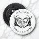 Levez votre verre à jamais avec cet ouvre-bouteille inoubliable « Jusqu'à ce que la mort nous sépare ». Avec deux mains de squelette formant un cœur autour d'une élégante écriture gothique, ce design audacieux en noir et blanc est personnalisé avec vos noms et date de mariage.