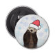 Un ouvre-bouteille avec une photo nature d'une jolie loutre tenant son visage dans ses pattes. Portant un casquette de Noël rouge, dessiné à la main. Un motif arrière - plan de flocon de neige.