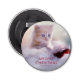 Un ouvre-bouteille avec la photo d'un chaton gingembre assis sur un chapeau de Père Noël blanc et rouge doux. Des lumières floues étincelantes bokeh arrière - plan. Jeu amusant - Meowy Christmas. Le texte est modifiable pour que vous puissiez le modifier, dites ce que vous voulez.