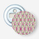 The image shows a circular bottle opener. The front features a colorful floral and geometric pattern in pink and green. The back is black with a metal opener.