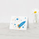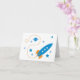 Une fusée rétro colorée s'envole à travers l'espace, passant devant des étoiles et une planète. Particulièrement amusant pour une carte d'anniversaire ou une invitation à une fête.