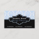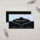 Carte de visite aux intérieurs damassés de bleu noir, avec motifs damassés de bleu et blanc. La partie inférieure est de couleur noire solide. Une bande noire et une bande bleue séparent les deux parties. Votre entreprise/nom est tapé sur un cadre noir élégant avec contour blanc et bleu.