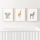 Ajoutez une touche finale à l'espace safari de votre petit avec cet ensemble de trois gravures d'éléphant, de girafe et de zèbre.