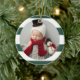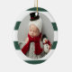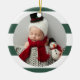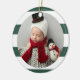 Cet élégant ornement à deux côtés de la photo keepsaké présente une photo de nouveau-né encadrée par un chasseur festif / pin vert et blanc rayé motif arrière - plan. Le dos de l'ornement comprend le libellé "Mon premier Noël" avec accent flocon de neige et le texte personnalisé pour le nom complet du bébé et l'année.
