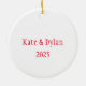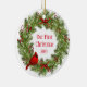This ceramic ornament is shown with a festive Christmas holiday berry wreath and cardinal bird print.