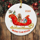 Un adorable Cocker Spaniel Dog couleur bouffon se trouve parmi des paquets cadeaux aux couleurs vives dans un sommier de Noël rouge et or orné. En haut se trouve un champ de texte qui peut être customisé pour votre nom ou l'année en cours. En bas se trouve un autre champ de texte personnalisé qui dit "Joyeux Noël". Les deux côtés de l'ornement ont la même image.