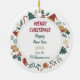 Ce joli ornement de vacances présente une aquarelle d'un adorable chiot Cocker Spaniel habillé dans son pull et son casquette d'hiver. L'image est encadrée dans une couronne de cercle colorée constituée de diverses images de vacances, dont un bonhomme de neige, des cloches, du sucre de canne, du stockage, du saint, et plus ! L'arrière de l'ornement a la même image de couronne avec votre texte personnalisé en vert, or et rouge.