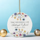Pretty wildflowers decorate the bottom of this colorful spring wedding keepsake Christmas ornament. Watercolor floral borders are perfect for a garden ceremony outdoors while flowers are in bloom. Elegant script dances above a beautiful orange, purple, yellow, and blue botanical meadow on this custom favor or newlywed gift.