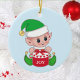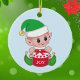 Joli elfe de Noël avec boîte cadeau sur ornement bleu clair. On croit que les elfes sont des petits anges de la terre. Joy text peut être personnalisé avec un texte court ou un monogramme.