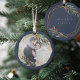 L'élégant ornement de Noël de photo présente une photo préférée entourée d'un faux cadre géométrique de feuille d'or avec du feuillage vert aquarelle et des baies rouges. Ajoutez vos noms et l'année, ou un message personnalisé, à l'envers dans un cadre correspondant.