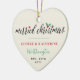 Cet ornement moderne et contemporain de Noël mariage de vacances comprend le mot "Joyeux Noël" dans une calligraphie en écriture noire simple et tendance avec un accent lunatique sainte mistletoe accent sur un arrière - plan blanc vanille. De l'autre côté, on retrouve une photo à fond plein recouvert d'une amande fleurie et le monogramme du couple en serif classique. Tout le texte et l'arrière - plan peuvent être changés en n'importe quelle couleur de votre choix. Illustration de fat*fa*tin. Facile à personnaliser avec votre propre message texte, nom, année, photo ou image. D'autres fonctions d'édition sont disponibles sur la page "modifier la conception". www.zazzle.com/fat_fa_tin www.zazzle.com/color_therapy www.zazzle.com/fatfatin_blue_knot www.zazzle.com/fatfatin_red_knot www.zazzle.com/fatfatin_mini_me www.zazzle.com/fatfatin_box www.zazzle.com/fatfatin_design www.zazzle.com/fatfatin_ink