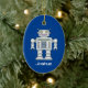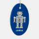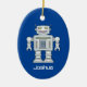 Kid's toy robot custom name Christmas tree tree ornament. Custom decorations with fun Holiday design for children. Fun first Christmas, Birthday ou baby shower vend idea for new baby boy or girl. Trendy decor personalized with kid's name or custom Holiday greeting. Un bébé empoisonné pour Newborn child ou soon to be maman. Make your own-x-ouvories for new son, daughter, grandson, granddaughter, grandchild, nephew, niece, etc. Cool illustration for small children. Blue or custom color background. Gold glitter string included. Upload your own photo on the back optionally.