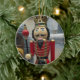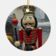 Cet ornement de Noël à double face coloré est doté d'un garde-Noisette avec une couronne d'or brillant, debout à l'extérieur d'une grotte.