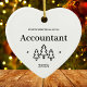 Premier Noël en tant que comptable ornement cardiaque. Élégante porcelaine céramique ornements de vacances en blanc avec lettrage noir. Avec des arbres de Noël et des étoiles.