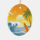 Design rond d'une scène de plage avec une petite île arborant un palmier et une planche de surf qui s'élève du sable, entourée de vagues bleues sous le soleil couchant.