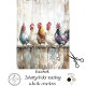 The featured artwork showcases five expressive chickens perched on a weathered wooden fence, each with distinct plumage — from blue-gray and white to reddish-brown and black with purple hues. Set against a whitewashed barnwood backdrop, the design blends country whimsy with artistic texture, ideal for farmhouse, spring, or animal-themed creations.