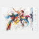"The Vibrant Voyagers" Diese lebendige und stilisierte Illustration zeigt ein Eichhörnchen und Kaninchen in mittlerer Bewegung, mit dynamischen Farbspritzen und Tinte, die Bewegung nahe legen. Das Eichhörnchen trägt eine rote Kappe nach hinten und fügt eine spielerische, menschenähnliche Eigenschaft hinzu. Die Verwendung von hellen Farben und abstraktem Stil macht das Bild visuell auffallend und dynamisch, um den lebendigen Geist des Eichhörnchens zu erfassen