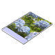 Tief blaue Hydrangeas, eingebettet in leuchtend grünes Blattwerk. Eine Grenze von hellblau entlang des Buchgrunds.