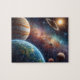 Explore the cosmos with this stunning deep space jigsaw puzzle! The breathtaking image features a close-up view of Earth at night alongside large planets, including Jupiter and Saturn with its rings, all set against a vibrant nebula of cosmic dust and distant stars. This artwork is perfect for astronomy lovers, science fans, or anyone who appreciates dramatic space art and the wonders of the universe. It makes an excellent unique gift for teens and adults or a challenging hobby activity.