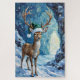 This whimsical magical realism illustration captures an elegant white-tailed deer, adorned with a velvet Santa hat and shimmering antlers, standing quietly by the entrance of a glowing ice cave. A mystical and beautiful holiday design.
