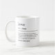 Erstellen Sie eine personalisierte Kaffee-Tasse mit Ihrer ganz eigenen Definition von Liebe und den Namen Ihrer Lieben, Paare oder Familienmitglieder. Moderne Liebe im Wörterbuchstil, anspruchsvolles Design in Schwarz und Weiß. Eine personalisierte Geschenkidee für Ihren Seelenverwandten, Ihre Mutter oder Ihren Vater, Ihre beste Freundin und so weiter. Ein einzigartiges und bedeutendes Geschenk für Geburtstage, Erwärmung, Verlobung, Mutter oder Väter Tag, wirklich jeden Anlass.