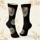 Verwandeln Sie ein Bild Ihres geliebten Hauses in elegante Socken. Stilvolle personalisierte schwarze Socken mit dem Bild Ihrer Katze als Hauptmerkmal. Chic Mode für einen Katzenbesitzer und Liebhaber von Haustieren. Der Druck besteht aus individuellen Fotos für Haustiere, gerahmt mit einem hübschen Blumenkranz und Set auf schwarzem Hintergrund.