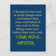 Das lautet: "Ich dachte, es sei cool, dass Dinge cool waren, bevor sie cool waren, bevor es cool war zu denken, dass Dinge cool waren, bevor sie cool waren." Oder so etwas. Denn, Hipster. Und Ironie.
