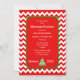 Cette invitation de Noël est présentée sur un arrière - plan motif de chevrons rouge et blanc. Un rectangle rouge surplombe le motif du chevron bordé de vert. Un arbre de Noël Chevron vert et blanc amusant apparaît en bas, tout comme le mot "Noël" et l'année. Tous les détails importants de l'invitation de Noël peuvent être customisés sur ce design. Copyright henishouseo