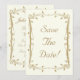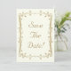 Schön und elegant antikes Gold Save the Date Hochzeitskartendesign mit dekorativen, leafy Schriftrollen rund um die Grenze. Das Design hat einen Elfenbeinhintergrund für ein elegantes Vintages Aussehen. Dieses Design kommt auch auf vielen anderen Papier-Produkte und auch Porto an den Anzug alle Ihre Hochzeit Set Bedürfnisse.