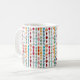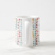 Diese Tasse hat ein modernes Design von Kreise und Ovalen in Retrofarben, die auf einem weißen Feld zusammengeschraubt sind.