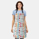Diese Schürze hat ein modernes Design von Kreise und Ovalen in Retrofarben, die auf einem weißen Feld zusammengeschraubt sind.