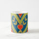 Eine weiße Tasse mit dekorativem Herzdesign in Rot, Blau, Grün und Gold aus einem Aquarellbild von Judy Adamson.