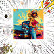 Eine stilisierte Abbildung einer Person, die neben einem Oldtimer stehend ist. Die Person trägt einen breit gebrannten Hut, ein rotes Oberteil und Jeans aus Denim. Das Auto verfügt über herausragende Hecktafeln und rundliche Scheinwerfer, was auf ein Vintages amerikanisches Automobildesign hinweist. Der Hintergrund ist abstrakt in Gelb-, Blau- und Rottönen gehalten und verleiht der Szene eine lebendige und künstlerische Touch