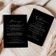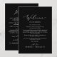 These delicate dark black wedding welcome itinerary cards are perfect for a modern wedding. The romantic minimalist design features lovely and elegant white typography on a black background with a clean and simple look. The front of the card features a welcome letter and the back of the card features the wedding itinerary. These notes are perfect for destination weddings and hotel guest welcome bags.