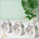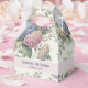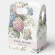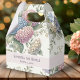 A wedding favor box featuring delicate hydrangea flowers in shades of dusty rose, light purple, and blue.