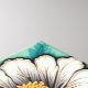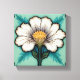A white flower with yellow pistils and green leaves on a light blue-green background, vintage floral design, symmetrical composition, decorative tile, botanical illustration, art nouveau style.