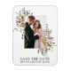 Moderne Wildblume Hochzeit Hochzeit Hochzeit Verlobung Ankündigung Save The Date Magnet umfasst gelbe, rosa, lila, staubblaue und weiße wilde Blume, Eukalyptus-Blätter, Salbei-grüne Blätter und andere botanische Vegetation auf einem goldenen Rahmen. Ein paar Fotos.