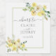 Die zarte Aquarellgelbe Blumen schmücken dieses hübsche Hochzeitsweinlabel am Nachmittag. Der Gartenhochzeitsgeschmack wird mit einem sanften, grünen Rechteck und botanischen Blätter unter den eleganten, sonnigen Pfannkuchen betont. Blumen und Licht, perfekt für eine Feier im Freien.