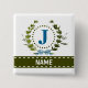 Ein zarter Efeu-Kranz mit einem blau gestreiften Bogen liegt auf einem frischen weißen Hintergrund. Das passende Hochzeitsdesign zeichnet sich durch das Monogramm "J" in blau aus. Button kann mit beliebigem Namen über dem grünen Band-Banner personalisiert werden. Design-Tipp: Verwenden Sie für den hier gezeigten Schriftart alle Caps für den Namen.