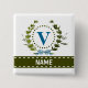 Ein zarter Efeu-Kranz mit einem blau gestreiften Bogen liegt auf einem frischen weißen Hintergrund. Das passende Hochzeitsdesign zeichnet sich durch das Monogramm "V" in blau aus. Button kann mit beliebigem Namen über dem grünen Band-Banner personalisiert werden. Design-Tipp: Verwenden Sie für den hier gezeigten Schriftart alle Caps für den Namen.