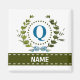 Ein zarter Efeu-Kranz mit einem blau gestreiften Bogen liegt auf einem frischen weißen Hintergrund. Das passende Hochzeitsdesign zeichnet das Monogramm "Q" in blau aus. Magnet kann mit jedem Namen über dem grünen Band-Banner personalisiert werden. Design-Tipp: Verwenden Sie für den hier gezeigten Schriftart alle Caps für den Namen.